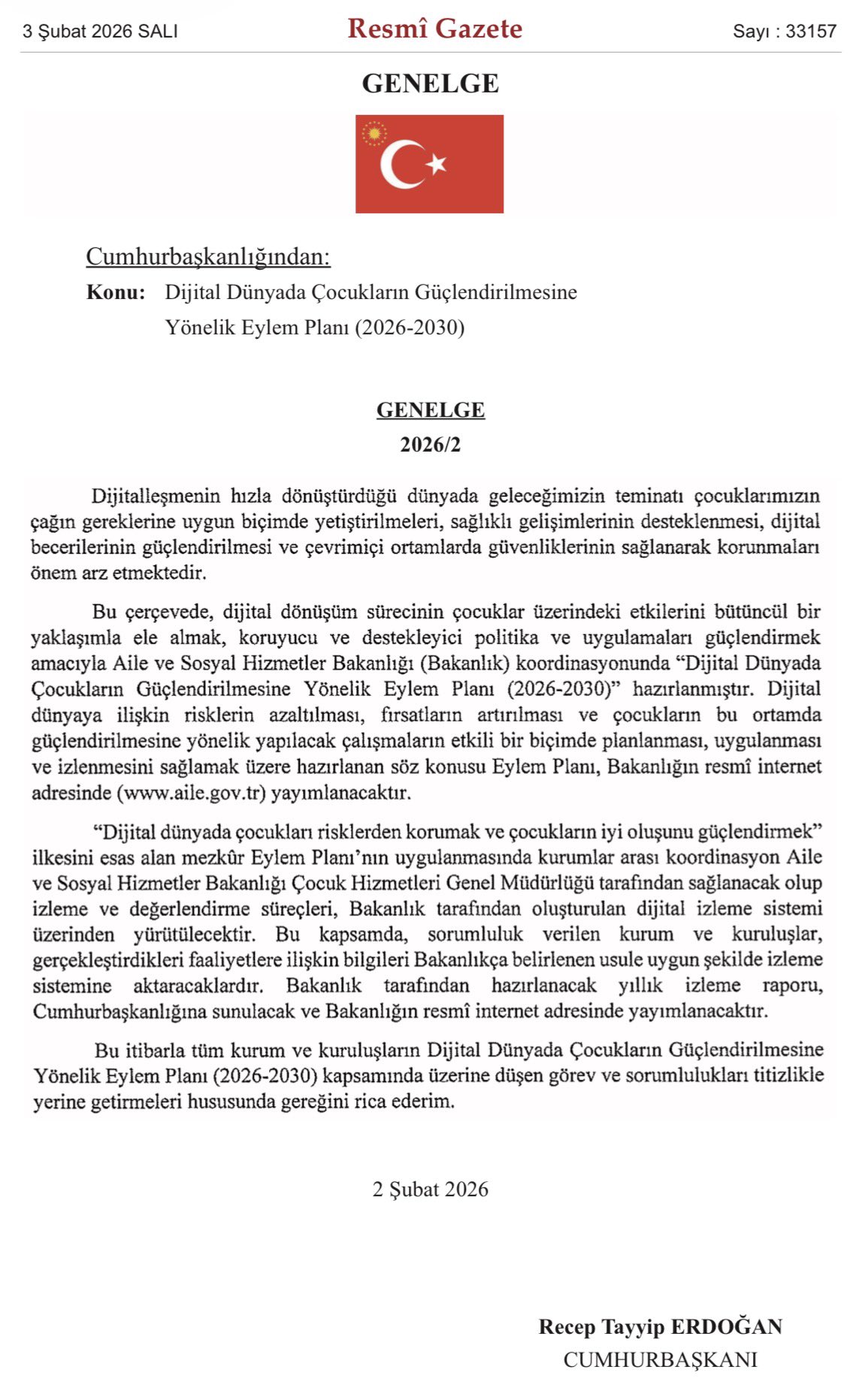 Aile ve Sosyal Hizmetler Bakanlığı, çocukların internet ortamındaki güvenliğini en üst seviyeye taşıyacak olan 2026–2030 Eylem Planı’nı, Cumhurbaşkanı Erdoğan’ın imzasıyla yayımlanan Resmî Gazete ilanıyla resmen hayata geçirdiğini duyurdu
