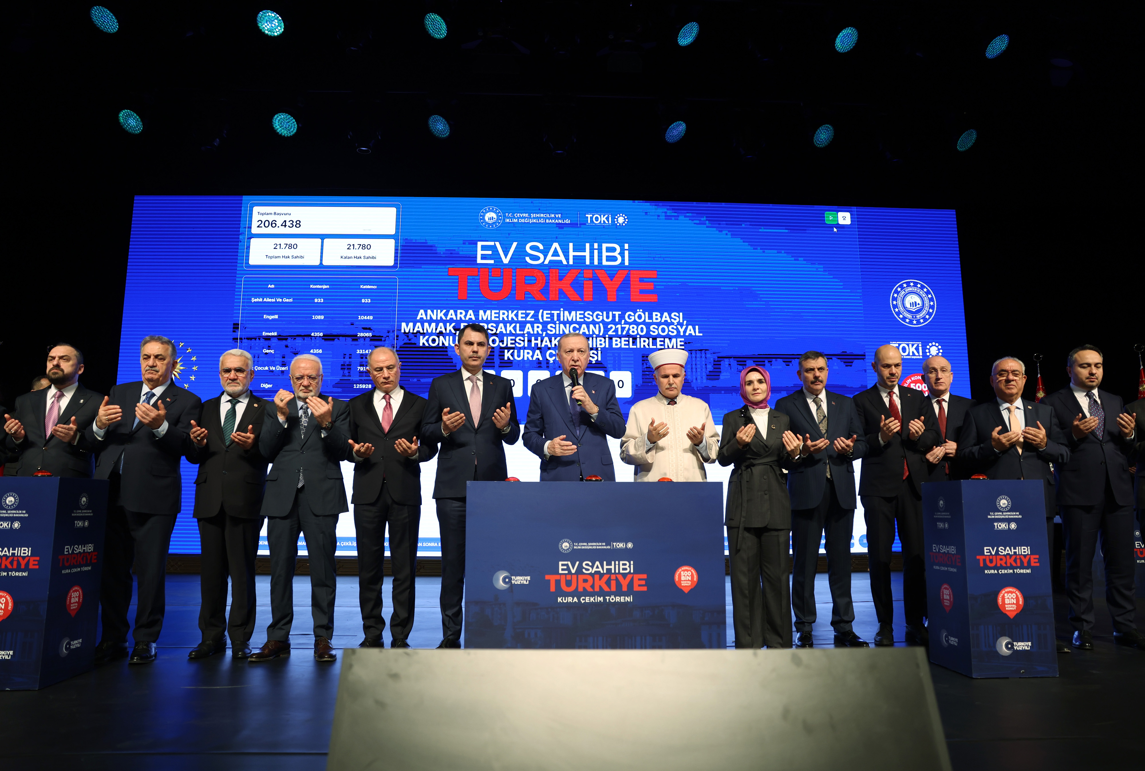 Törenin ana teması olan Ankara’daki 31 bin 73 konutluk kura çekimi hakkında da bilgiler veren Erdoğan, 500 Bin Sosyal Konut Projesi'nin hız kesmeden sürdüğünü belirtti. Deprem bölgesindeki inşa çalışmalarının bu yıl içinde tamamlanacağını, Ankara dahil diğer şehirlerdeki teslimatların ise önümüzdeki yılın Mart ayından itibaren başlayacağını müjdeledi. Vatandaşların sağlık ve huzur içinde oturması temennisinde bulunan Erdoğan, Çevre, Şehircilik ve İklim Değişikliği Bakanlığına özverili çalışmalarından dolayı teşekkür etti. Ramazan ayının manevi ikliminde bu töreni gerçekleştirmenin mutluluğunu yaşadıklarını söyleyen Cumhurbaşkanı, devletin milletine sunduğu "Ev Sahibi Türkiye" vizyonunun sosyal devlet ilkesinin en somut örneği olduğunu vurguladı.