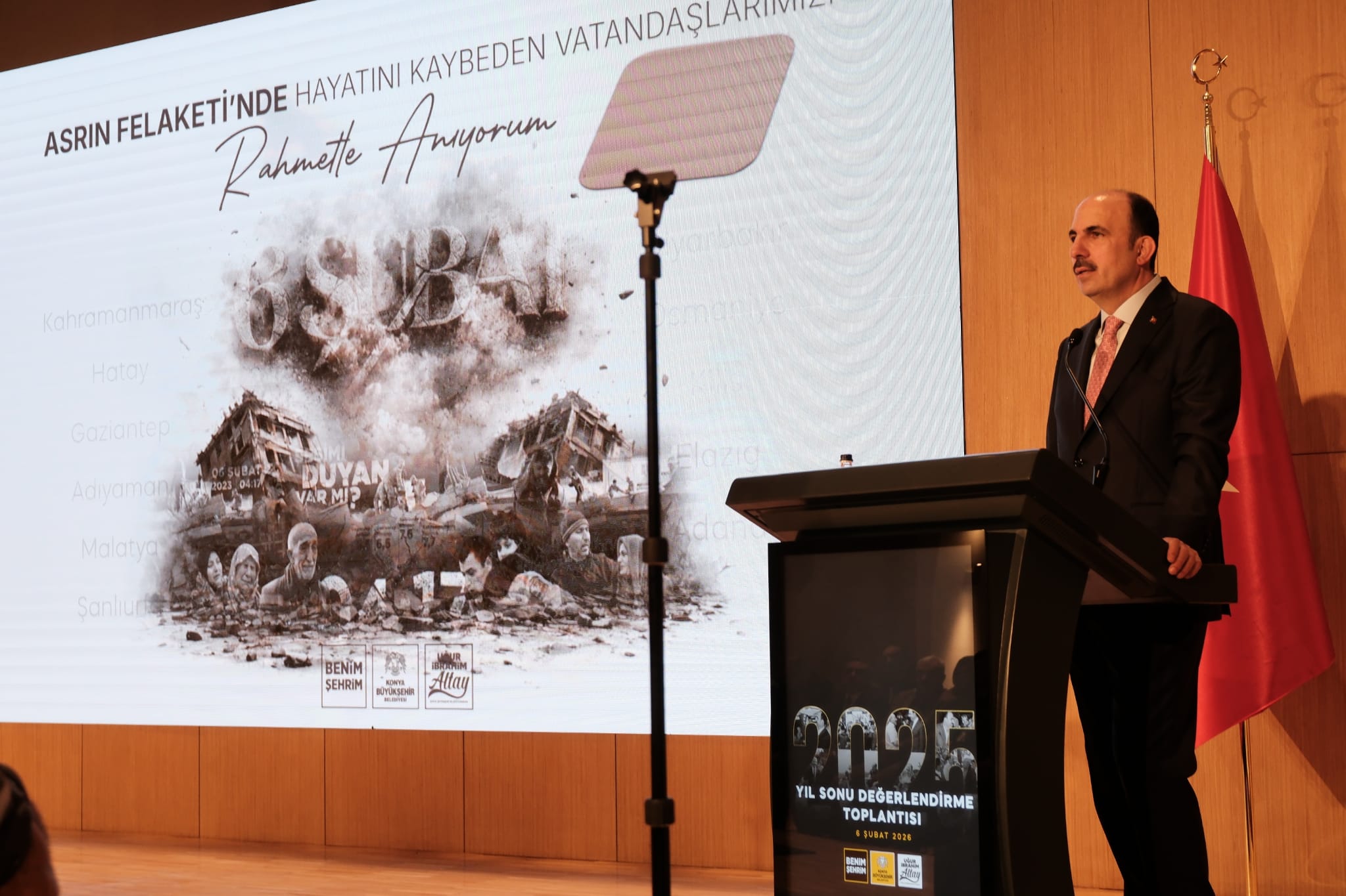 Konya Büyükşehir Belediye Başkanı Uğur İbrahim Altay, 2025 yılı değerlendirme toplantısında 6 Şubat deprem şehitlerini anarken, ilçelere yapılan dev yatırımlar ve "Konya Modeli Belediyecilik" projeleriyle şehrin geleceğini mühürledi